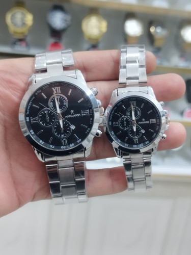 ساعت رومانسون ست زنانه و مردانه تقویم دار طرح 3 موتور استیل رنگ ثابت ضد آب همراه با دوتا جعبه رایگان و دوباتری اشانتیون