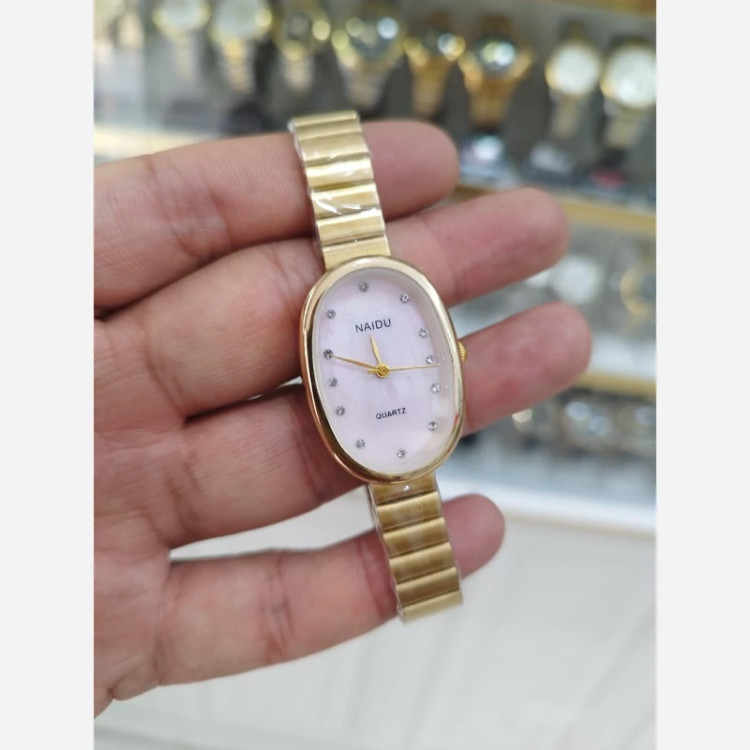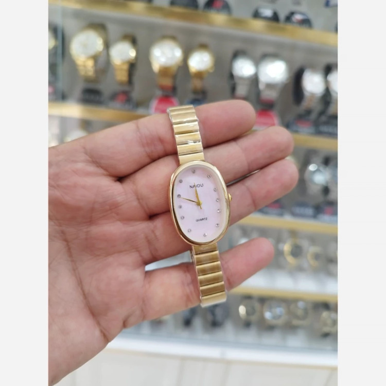 ساعت زنانه صفحه بیضی صورتی بند استیل رنگ ثابت قفل ریلی ضد آب درحد دست شستن همراه با باتری اشانتیون