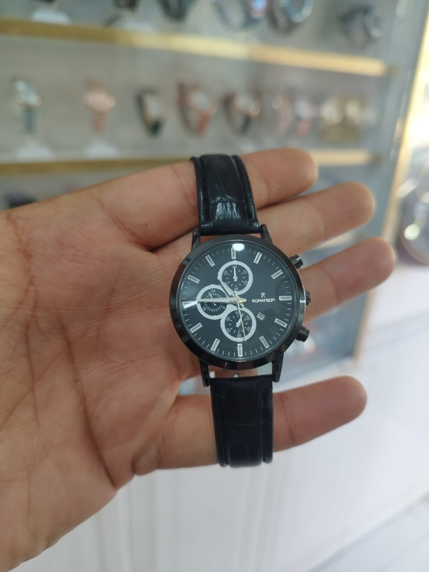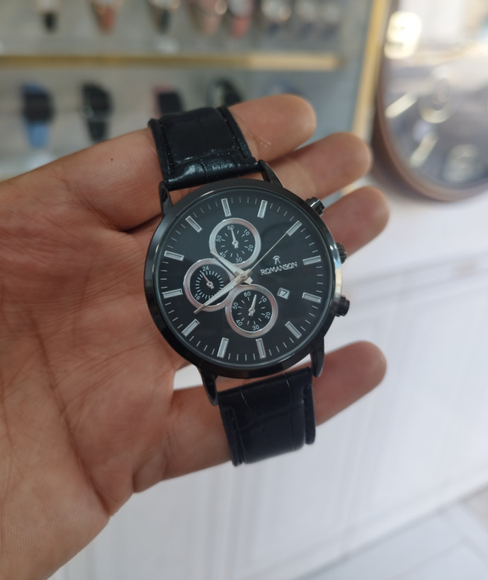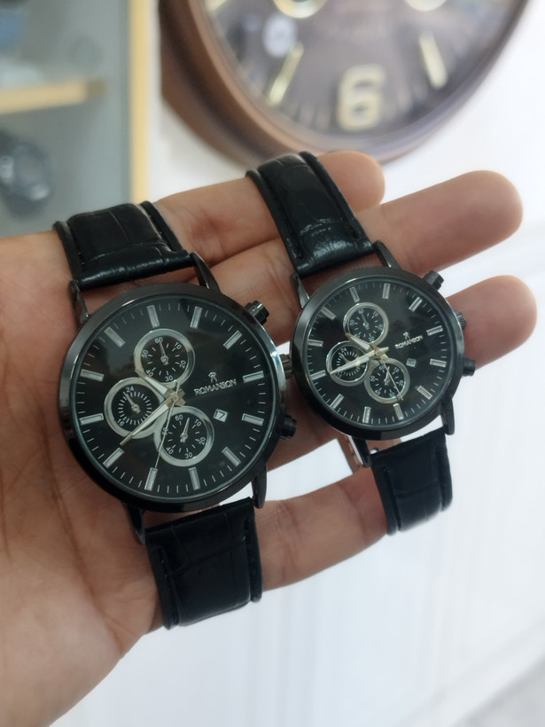 ساعت ست رومانسون زنانه و مردانه تقویم دار طرح 3موتور رنگ ثابت بند چرم قفل سگکی همراه با دوتا جعبه رایگان و دوباتری اشانتیون