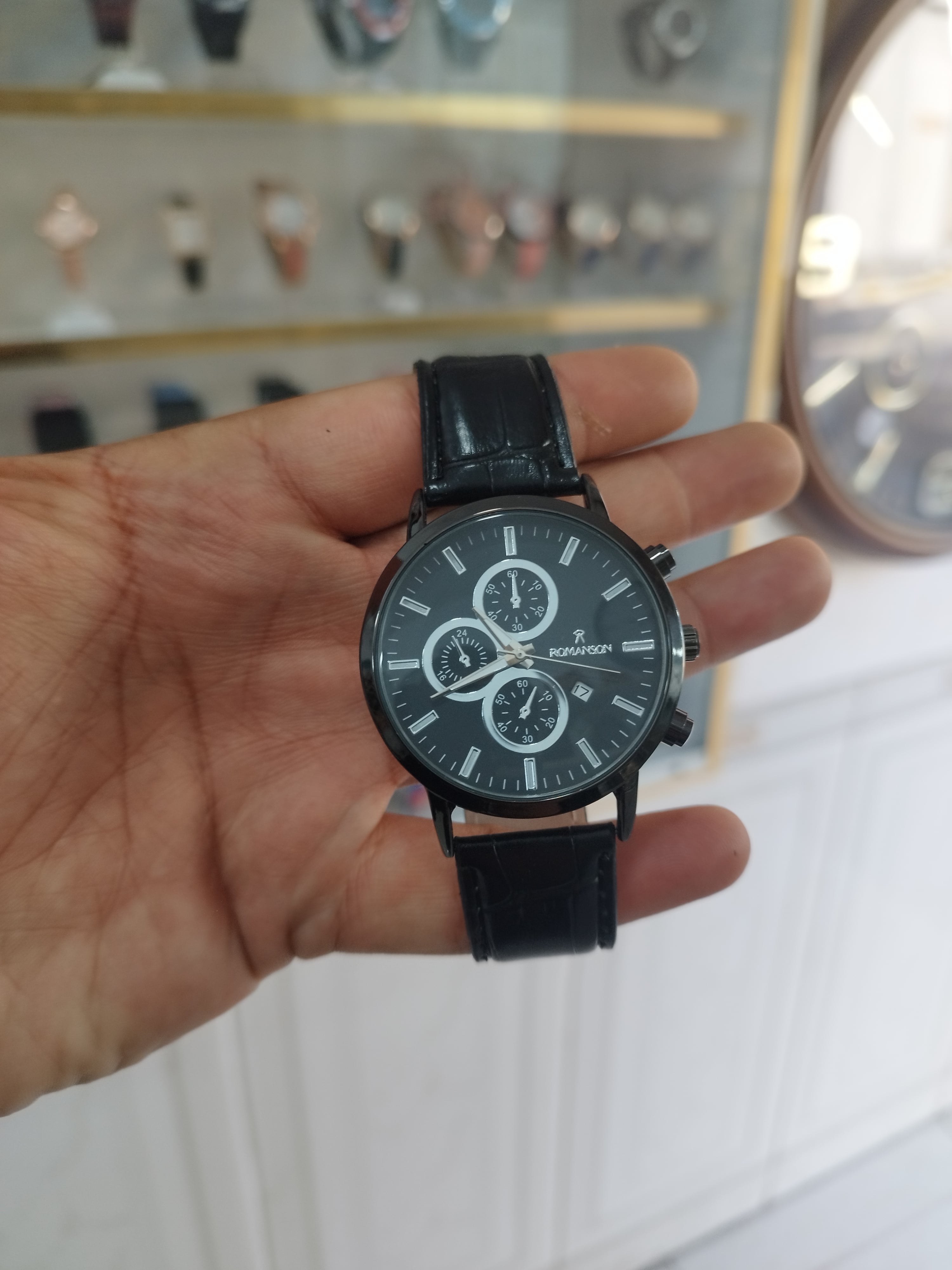 ساعت ست رومانسون زنانه و مردانه تقویم دار طرح 3موتور رنگ ثابت بند چرم قفل سگکی همراه با دوتا جعبه رایگان و دوباتری اشانتیون