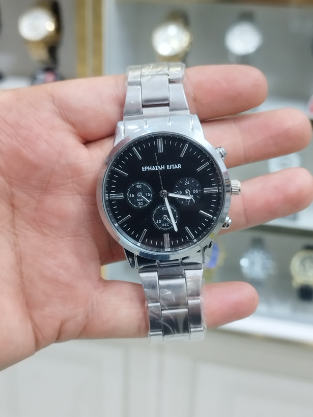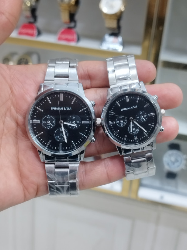ساعت ست زنانه و مردانه استیل طرح 3موتور رنگ ثابت بند استیل قفل فشاری همراه با دوتا جعبه رایگان و دوباتری اشانتیون