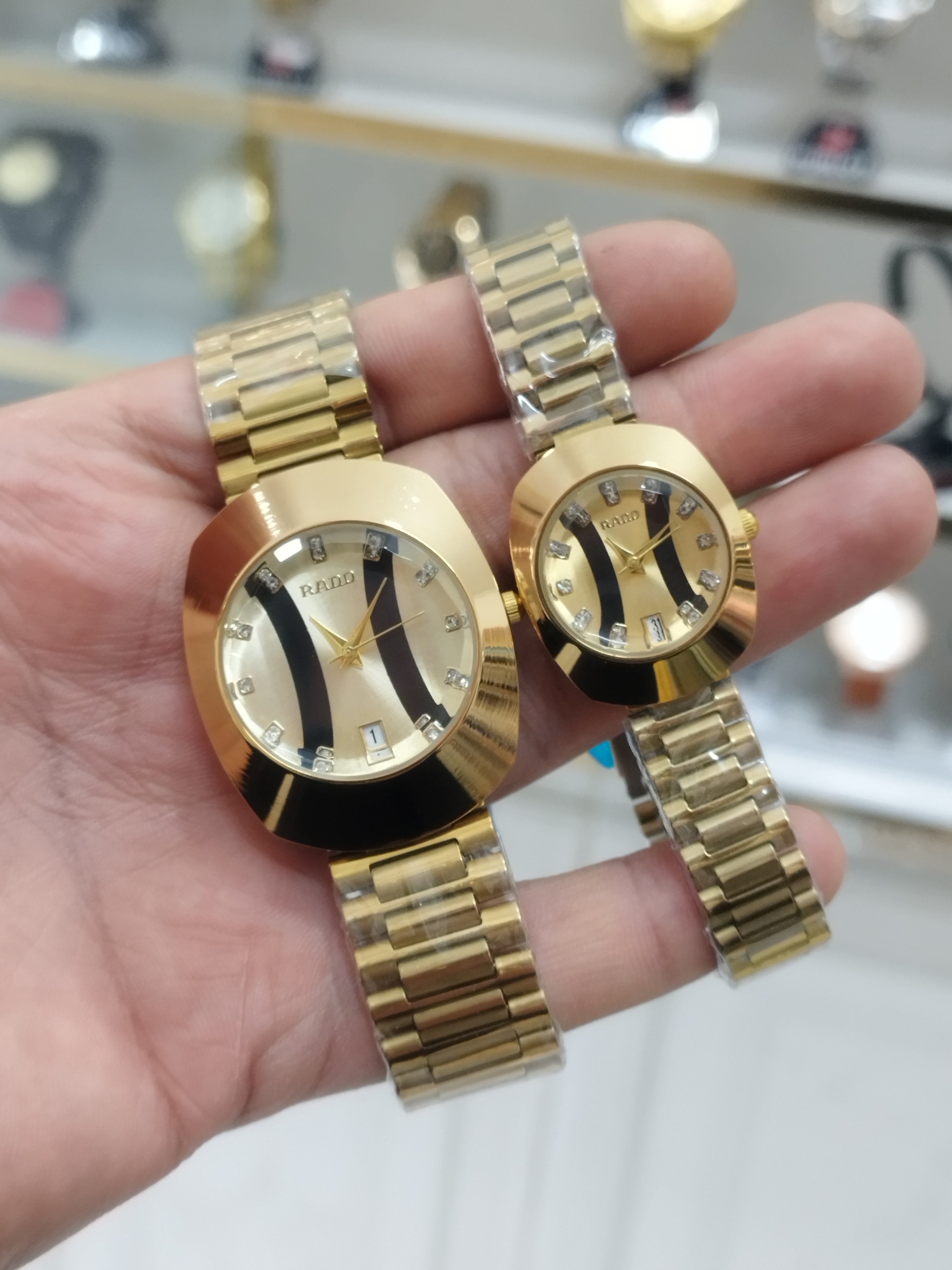 ساعت رادو ست زنانه مردانه صفحه تخم مرغی استیل رنگ ثابت ضدآب تقویم دار قفل مشابه اصلی کشیی پشت ساعت داخل ساعت و روی قفل رادو حک شده همراه با دوتا جعبه رایگان و دوباتری اشانتیون