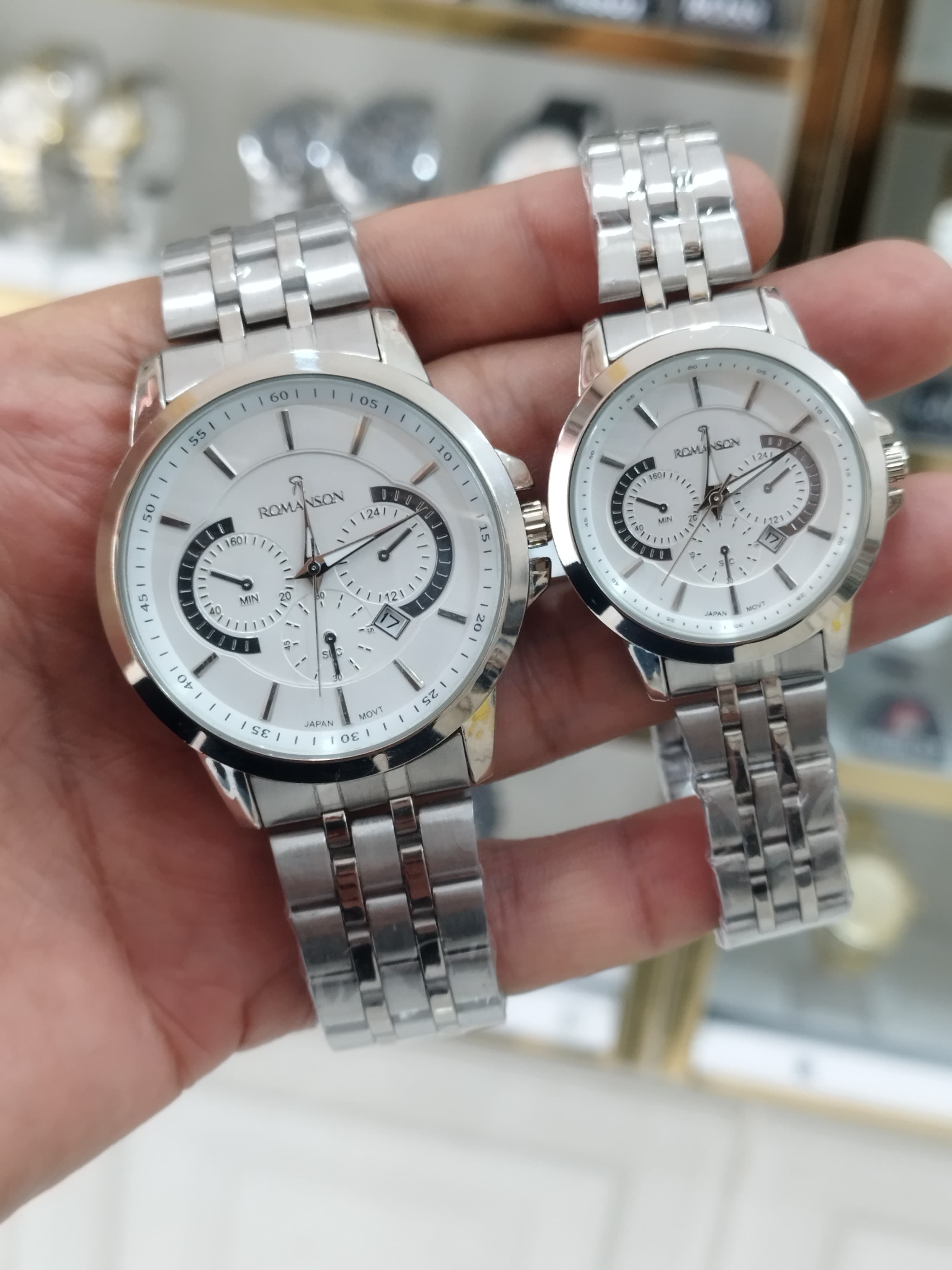 ساعت رومانسون ست زنانه و مردانه تقویم دار طرح 3 موتور استیل رنگ ثابت ضد آب همراه با دوتا جعبه رایگان و دوباتری اشانتیون*