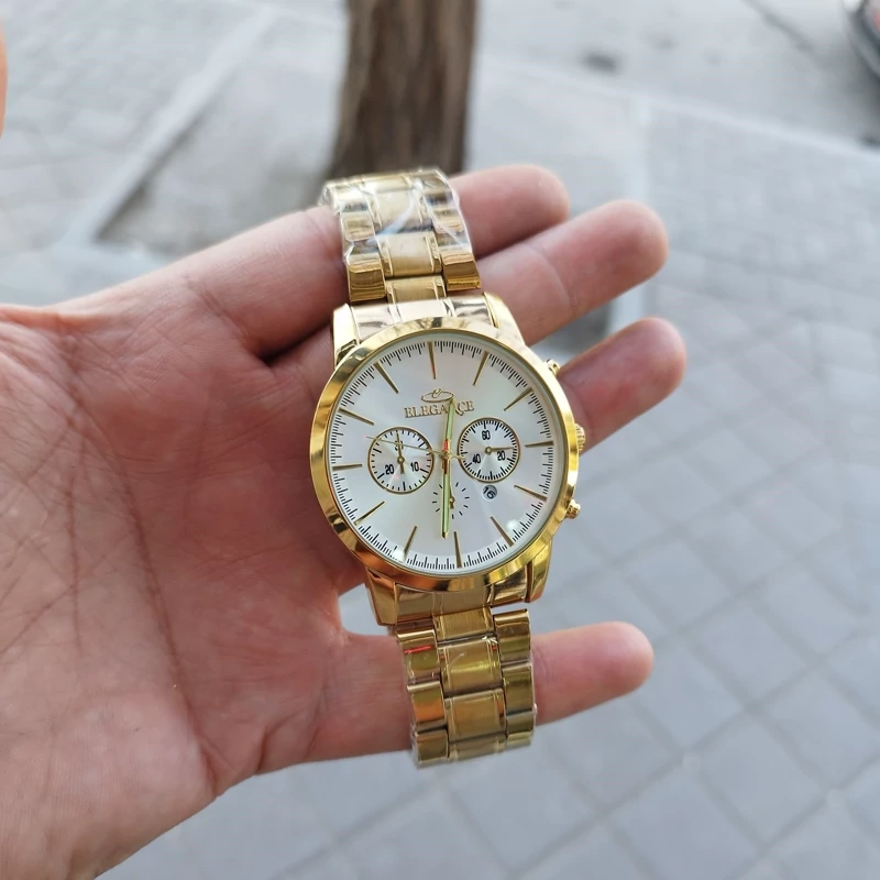 ساعت مردانه الگانس تقویم دار طرح 3موتور استیل رنگ ثابت ضد آب ارسال رایگان همراه با باتری اشانتیون و جعبه رایگان