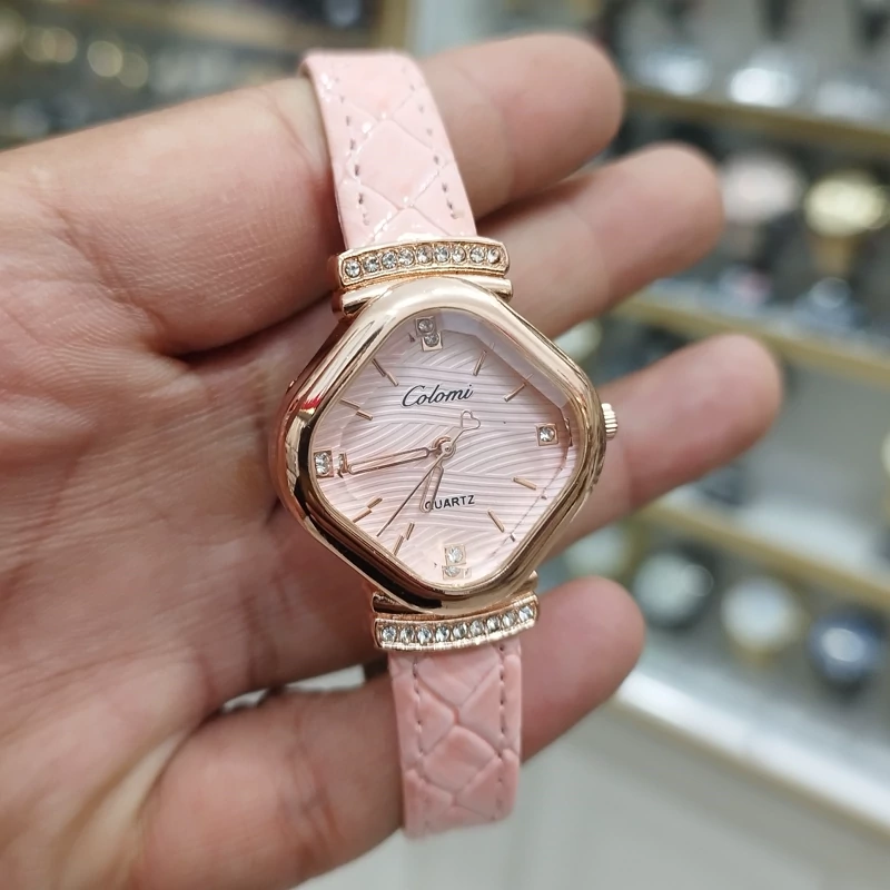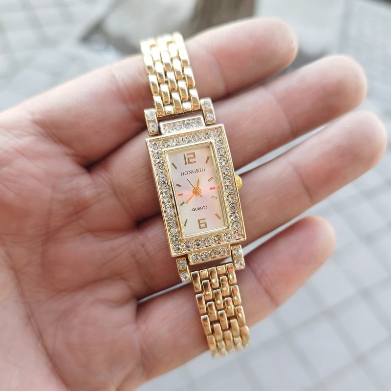 ساعت زنانه دخترانه صفحه مستطیل دور نگین پرس بدون ریزش رنگ ثابت ضد آب همراه با باتری اشانتیون